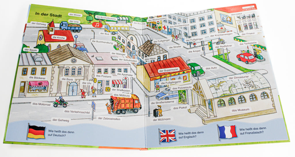Höre Wörter, Sätze und lustige Lieder in Deutsch, Englisch und auf Französisch.