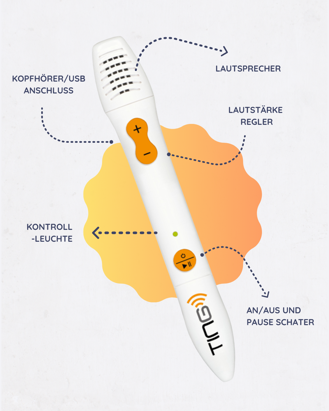 Der Lautsprecher gibt den Ton wieder, die Lautstärketasten regeln die Lautstärke. Der Kopfhörer-/USB-Anschluss dient zum Laden und für externe Kopfhörer. Die Kontrollleuchte zeigt den Status des Stifts an. Mit dem An/Aus- und Pausenknopf wird der Stift ein- und ausgeschaltet oder pausiert.